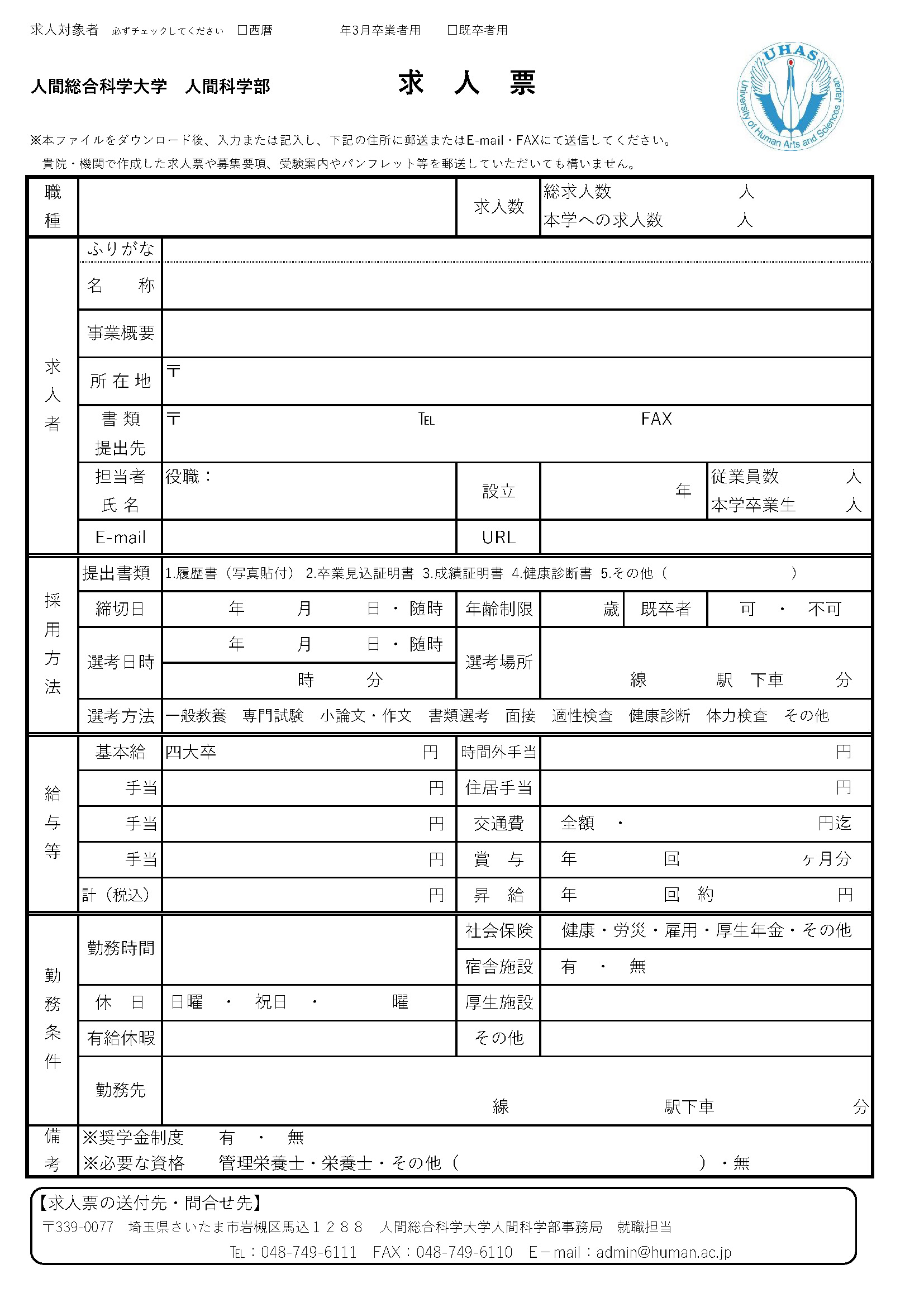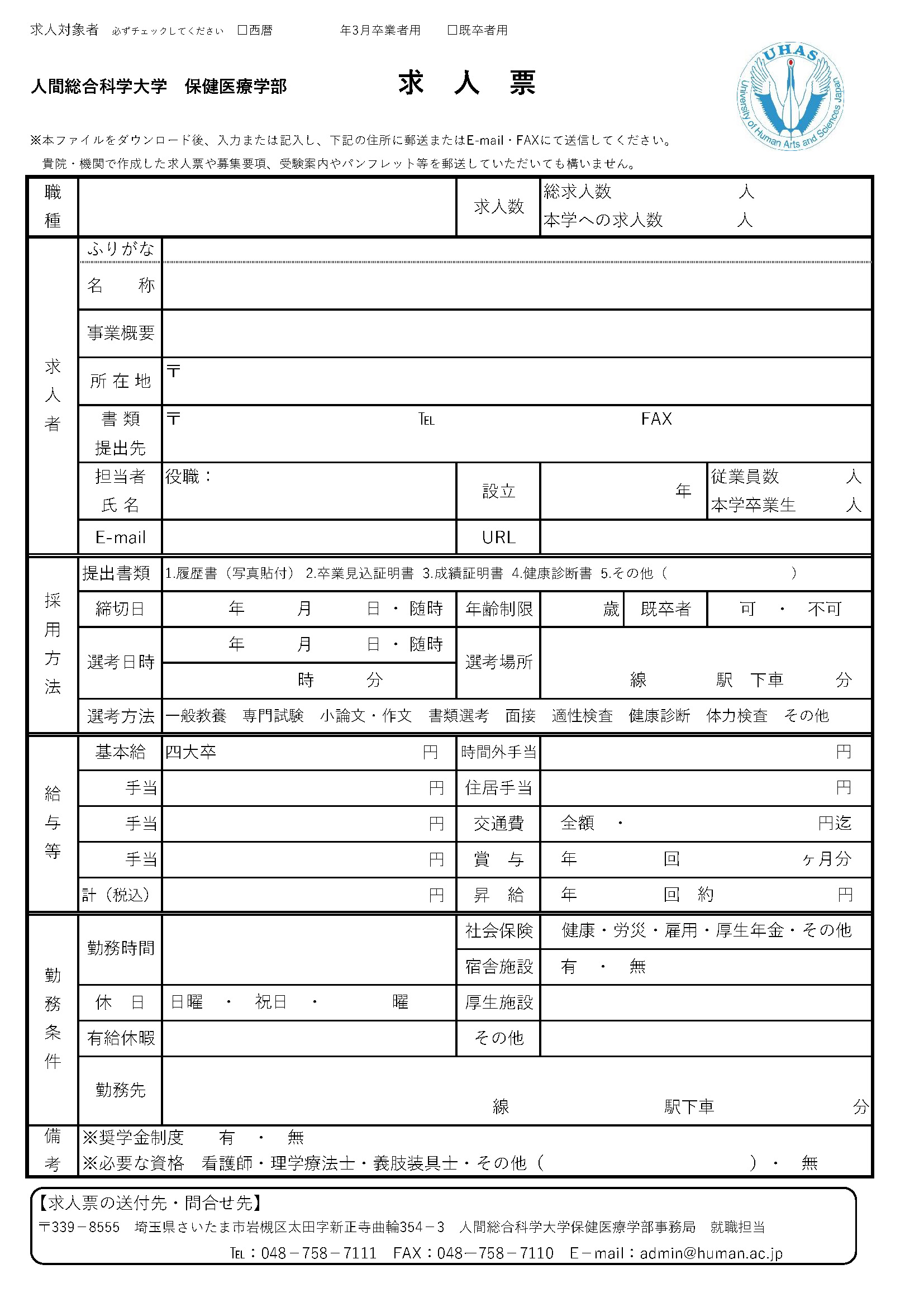 「企業・病院」専用の求人票をご用意されていない時は、本学専用の求人票を用意しておりますので、各キャンパスの求人票をダウンロードの上プリントアウトしてご利用下さい。