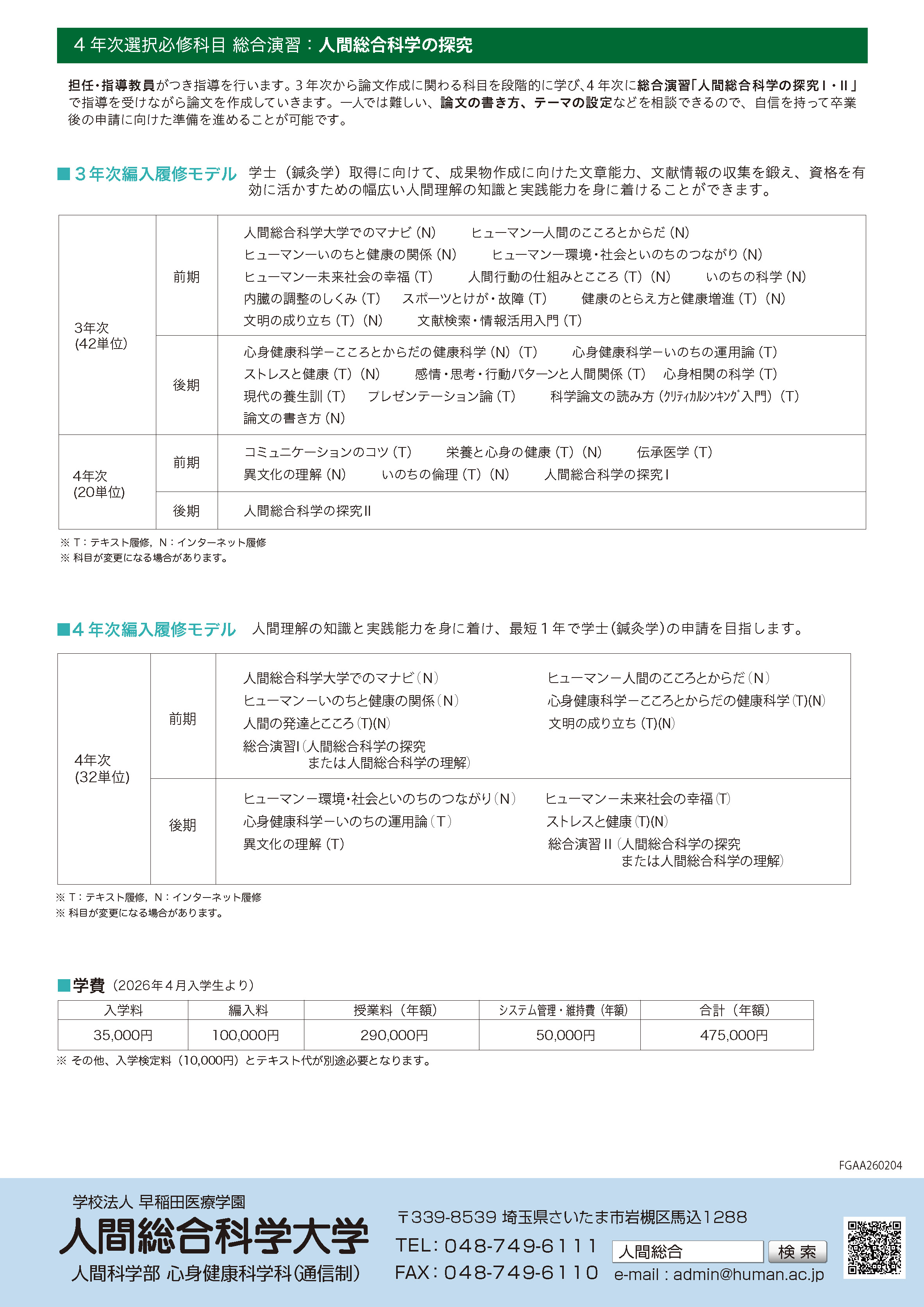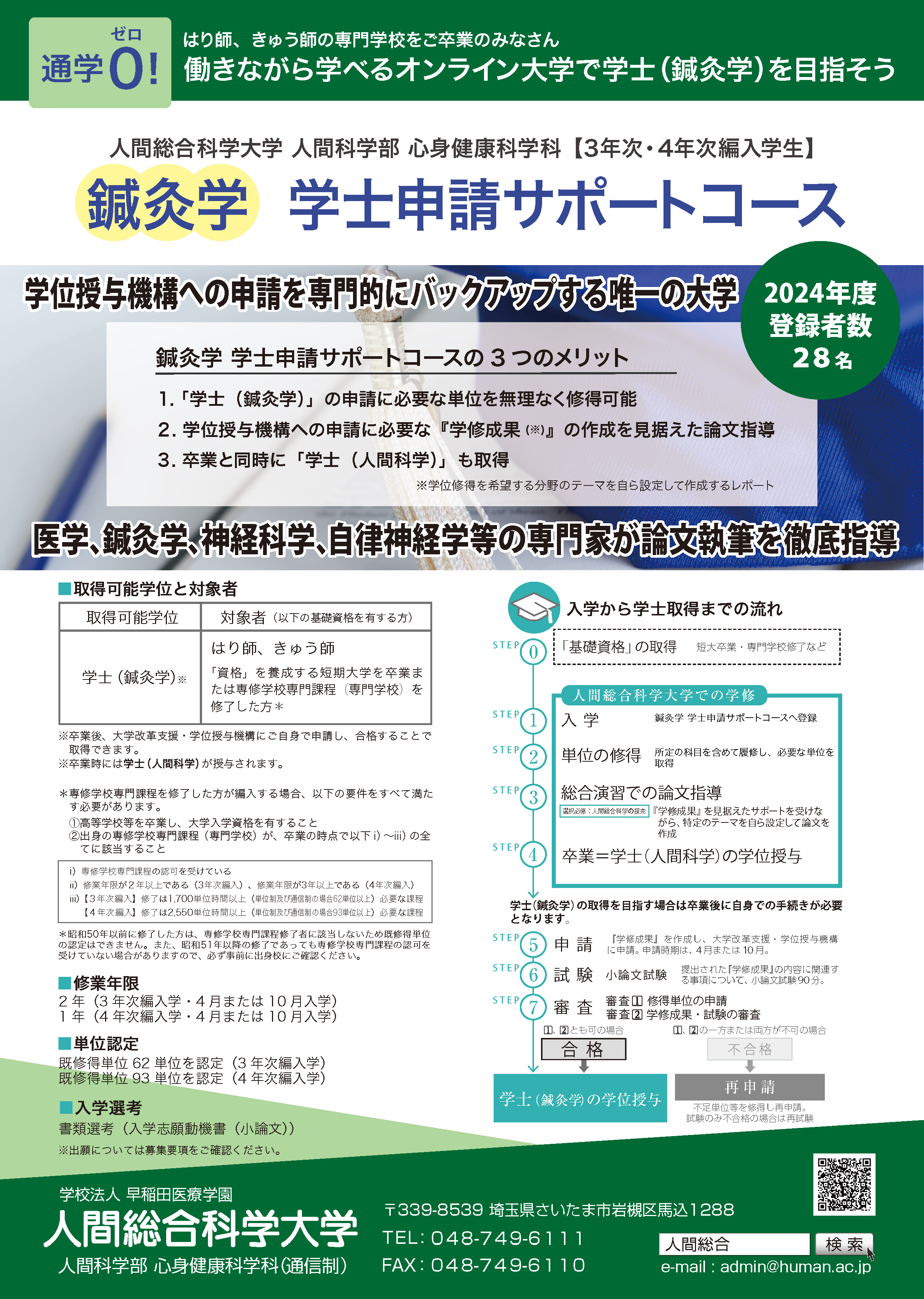 はり師・きゅう師の専門学校をご卒業の方へおすすめする3年次・4年次編入学のコースです。大学卒業資格である学士(人間科学)の学位取得をめざすことに加え、卒業後に専門の学士(鍼灸学)を学位授与機構へ申請するのに必要な単位の修得と学修成果のレポート作成をサポートいたします。