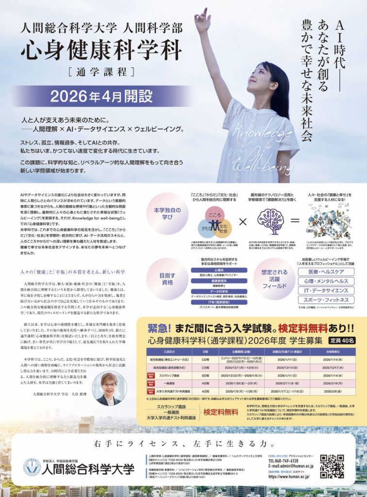 2025.11.22 通学制 トピックス産経新聞に全面広告が掲載されました 本日2025年11月22日(土)の産経新聞(埼玉版)に、2026年4月開設の心身健康科学科(通学課程)に関するカラー広告を掲載しました。 こころ、からだ、文化・社会の側面から「人間」に科学的にアプローチする「心身健康科学」を広く知っていただくとともに、「AI時代──あなたが創る豊かで幸せな未来社会」というメッセージをお伝えしています。